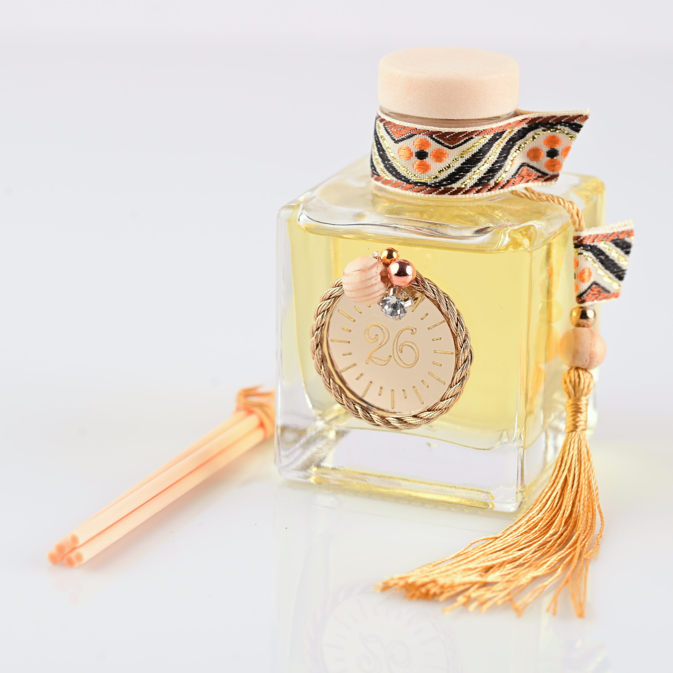 Τετράγωνο diffuser με διακοσμητική κορδέλα και κρεμαστό μεταλλικό γούρι “26”. Δίνει άρωμα και στυλ στο σαλόνι, το γραφείο ή το υπνοδωμάτιο.