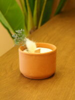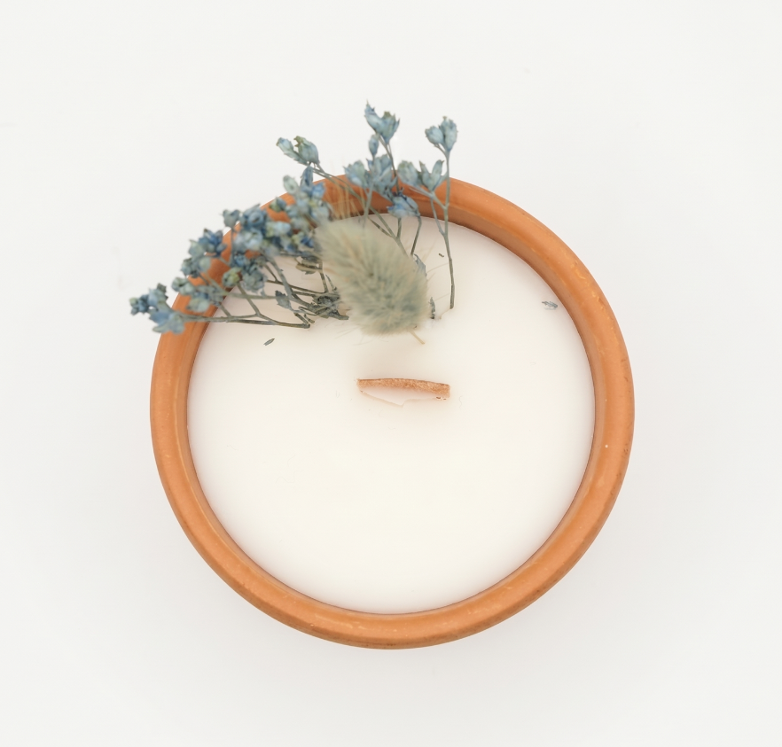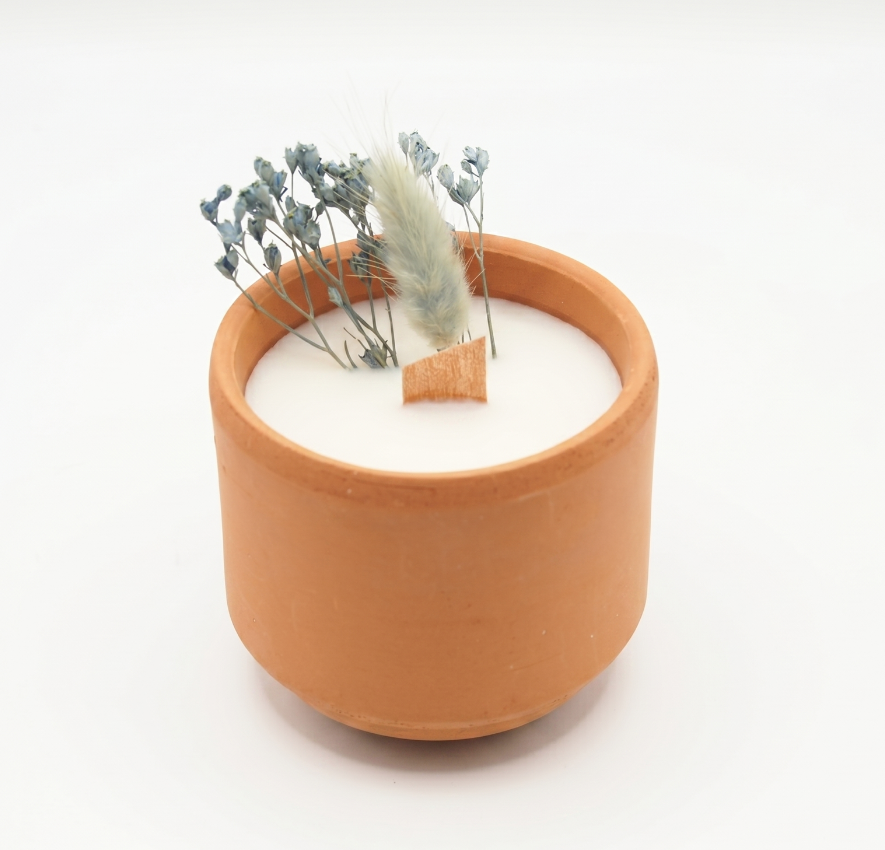 Χειροποίητο αρωματικό κερί από φυσικό κερί σόγιας σε κομψό κεραμικό δοχείο terracota.