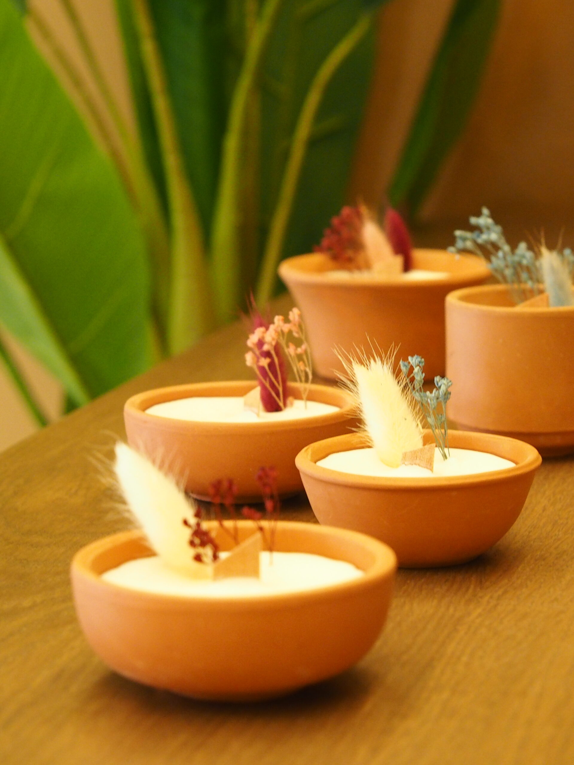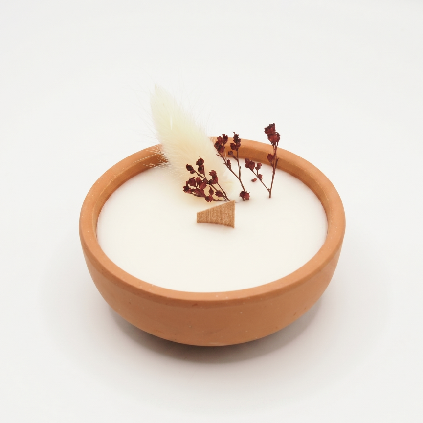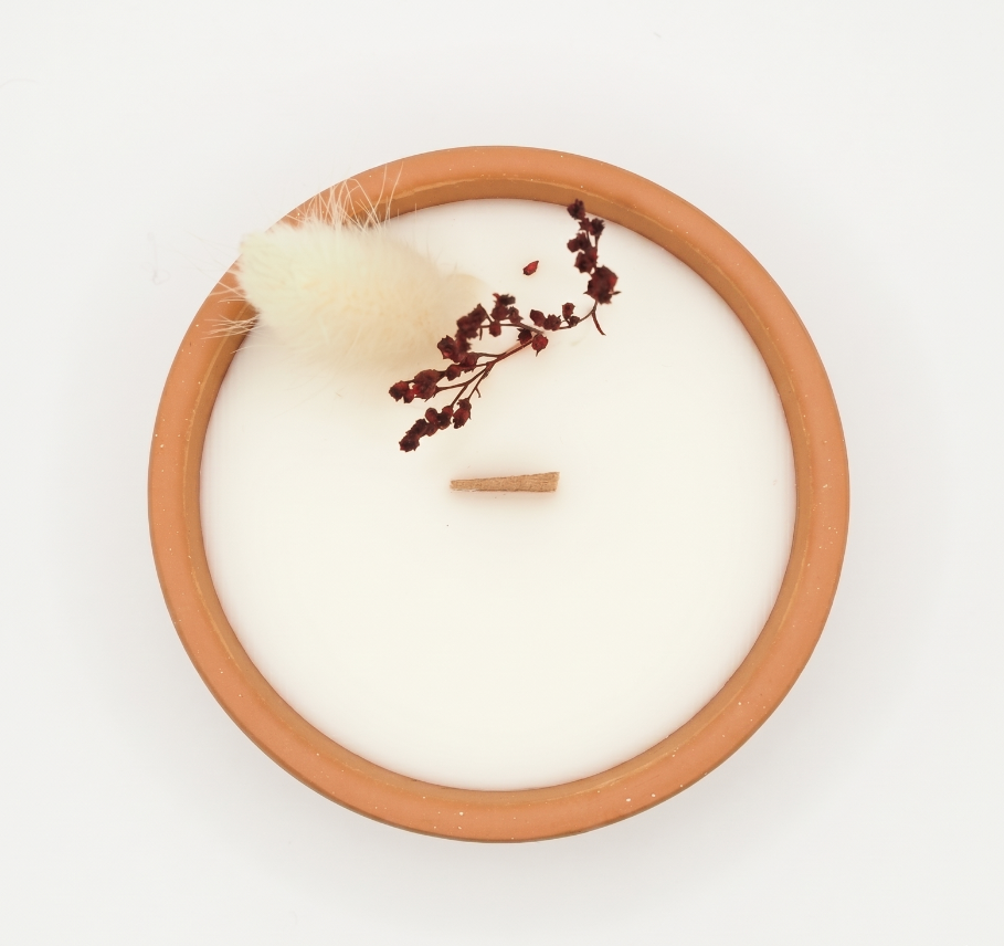 Χειροποίητο αρωματικό κερί από φυσικό κερί σόγιας σε κομψό κεραμικό δοχείο terracota.